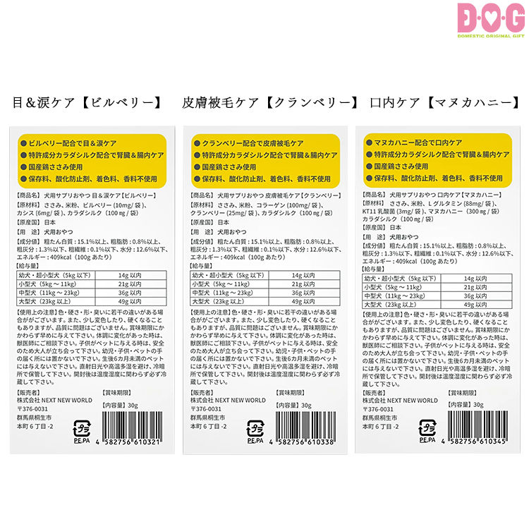 【クランベリー】ささみ、米粉、コラーゲン(100mg/袋)、クランベリー(25mg/袋)、カラダシルク(100㎎/袋)